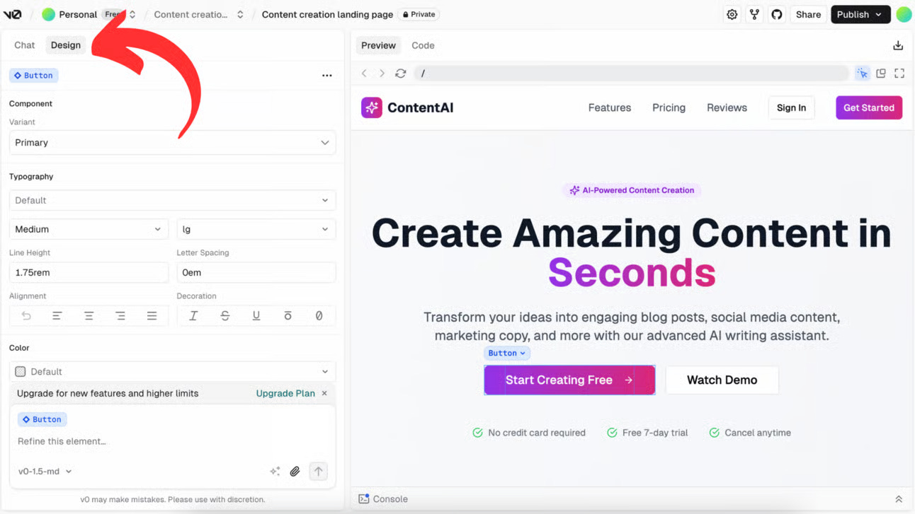 Truy cập v0 và yêu cầu giao diện người dùng mong muốn của bạn, ví dụ: "Tạo trang đích cho công cụ tạo nội dung AI"