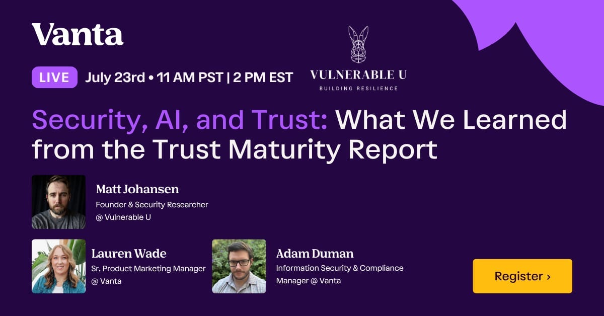 🗓️ Tham gia hội thảo trực tiếp ngày 23/7 cùng Vanta và Matt Johansen (Nhà sáng lập Vulnerable U) để khám phá báo cáo mới và học cách xây dựng bảo mật vững chắc ở mọi giai đoạn.