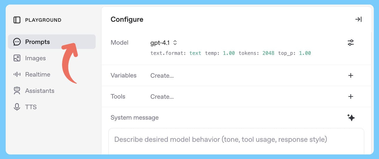 Truy cập OpenAI Playground và vào mục “Prompts”