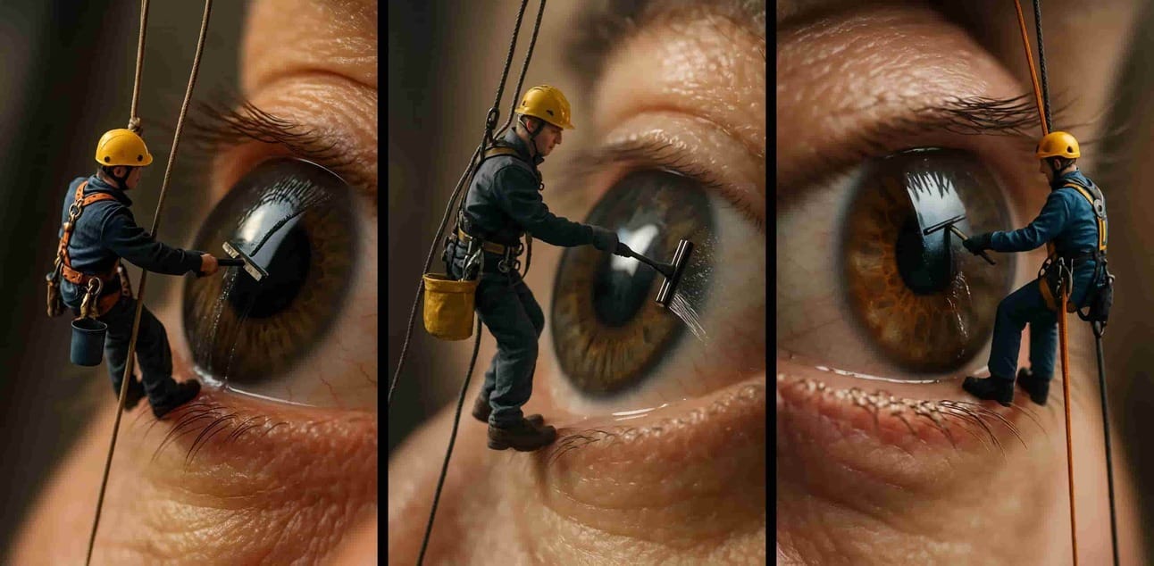 Cảnh siêu thực: Một người tí hon, mặc đồ bảo hộ, dây an toàn, đang đứng trên một nhãn cầu khổng lồ – cẩn thận lau mắt bằng cây gạt nước. Đôi mắt chi tiết, phản chiếu ánh sáng và tĩnh mạch. Cảm giác thật kỳ diệu và rùng mình.