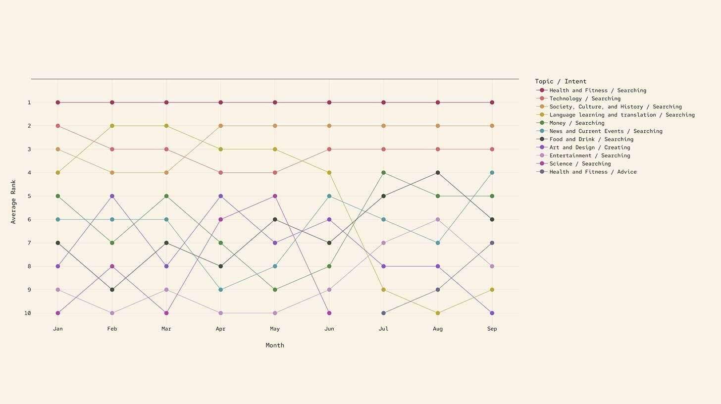 Lập trình chiếm ưu thế trong tháng Giêng, trong khi các chủ đề xã hội nổi lên vào cuối năm, phản ánh sự chuyển dịch từ những người tiên phong sang đối tượng khán giả rộng hơn, phổ biến hơn.