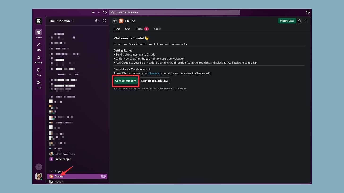 Giờ bạn sẽ thấy nó ở góc dưới bên trái của Slack. Nhấp vào “Kết nối tài khoản” và cấp quyền truy cập Slack cho Claude.