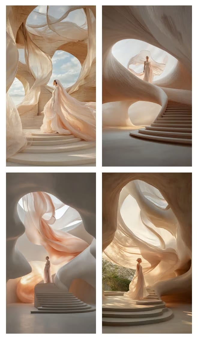 Midjourney prompt: bức ảnh hiện thực tối giản của một người phụ nữ xinh đẹp, đứng trong cầu thang xoắn, vải trong suốt thoáng khí bung bay về phía trái của cầu thang, phong cách điện ảnh, ánh sáng ban ngày, màu be --chaos 20 --ar 9:16 --v 6.1 --stylize 300 --personalize 9h9ja5c