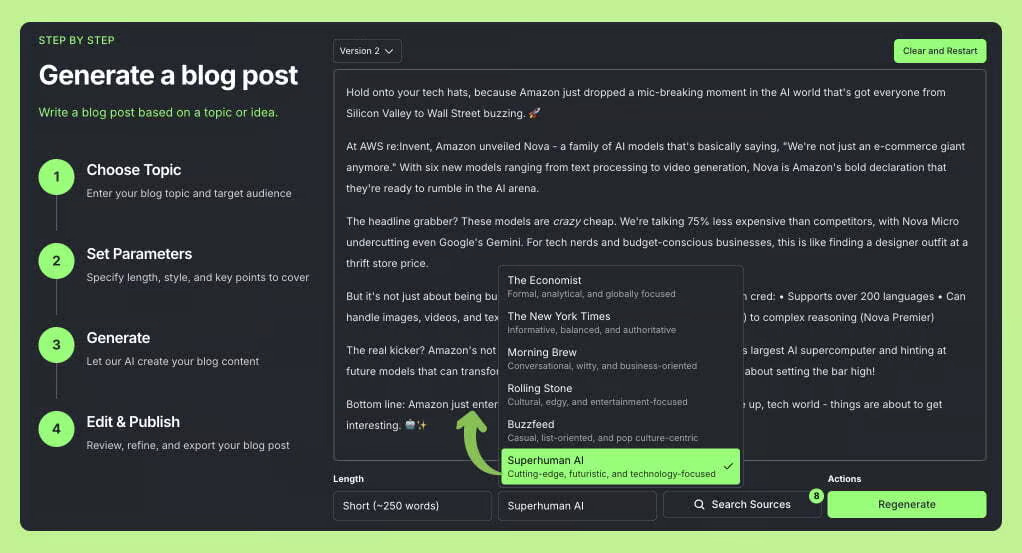 Sao chép văn bản của bạn để sử dụng. Bạn có thể xóa nó và khởi động lại để tạo một bài viết blog khác. Hoặc chọn một phong cách khác và nhấp vào Regenerate.