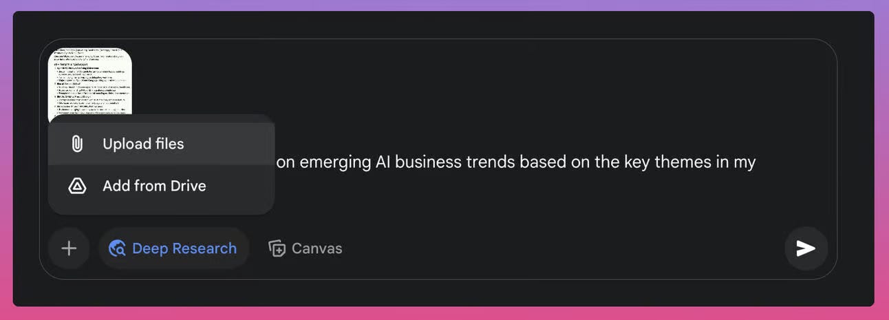 Tải lên bất kỳ tệp nào (PDF, DOCX, hình ảnh, bảng tính, v.v.) bạn muốn Gemini phân tích