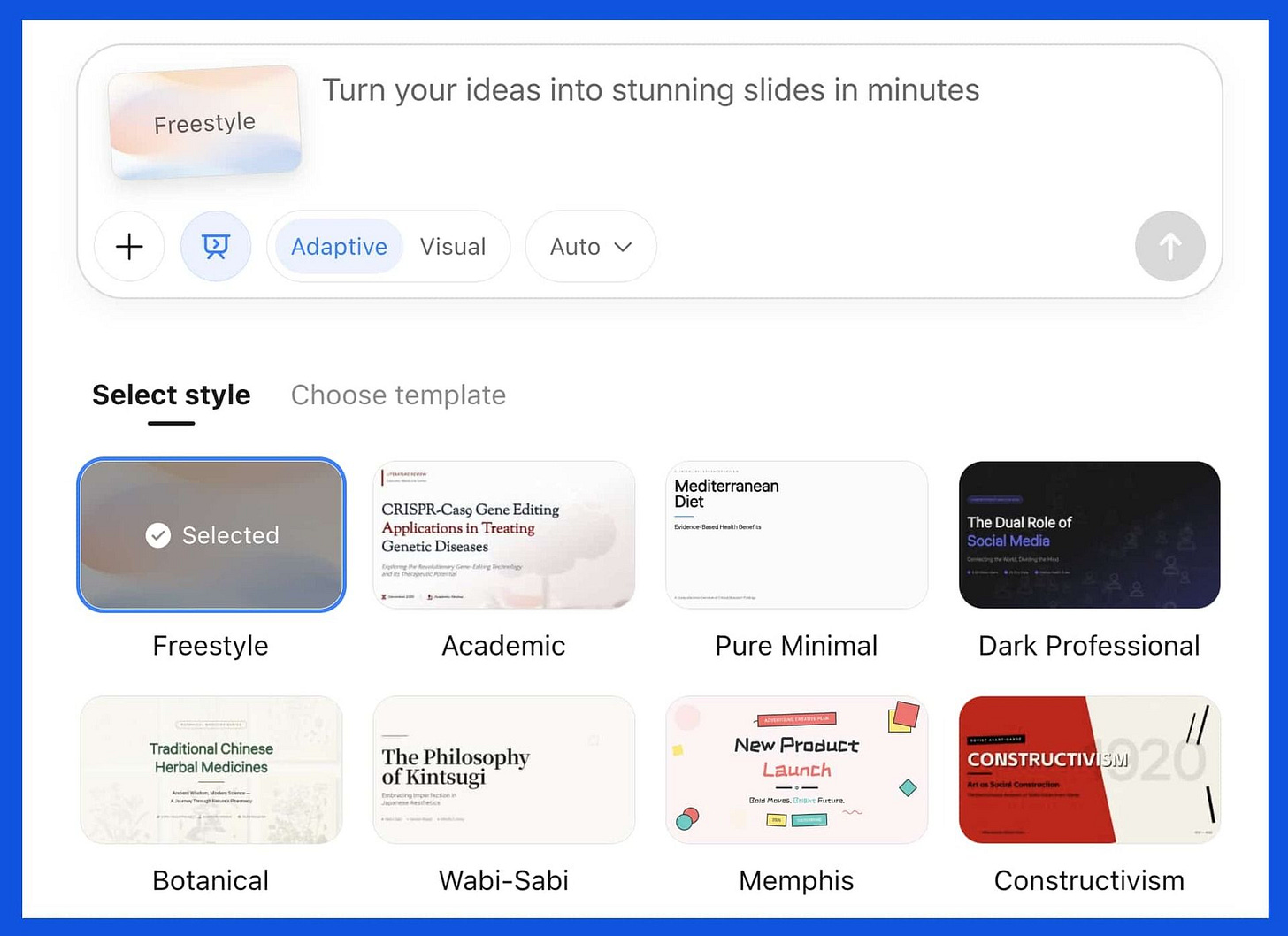 Tùy chỉnh thiết kế: Chọn phong cách thuyết trình, mẫu giao diện (template) và lựa chọn giữa chế độ “Adaptive” (Nghiên cứu sâu) hoặc “Visual” (Thiên về sáng tạo/hình ảnh).