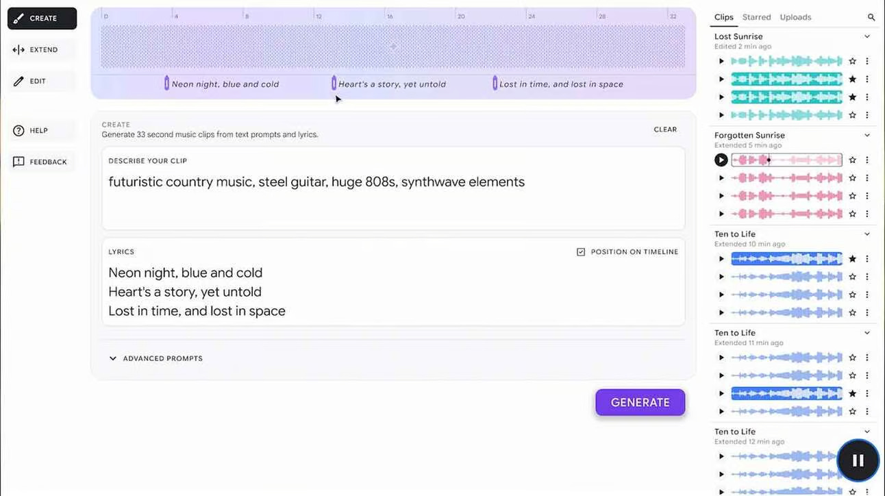 Các tính năng “Tạo,” “Mở rộng,” và “Chỉnh sửa” mới của nền tảng cho phép nhạc sĩ tạo ra các bản nhạc, tiếp tục các ý tưởng âm nhạc, và chuyển đổi các đoạn clip thông qua các lệnh văn bản.