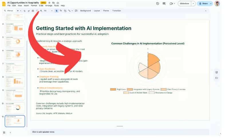 - Khi hoàn tất, xem lại slide deck, xuất sang Google Slides để chỉnh sửa, hoặc thiết lập cập nhật tự động cho nội dung luôn mới.