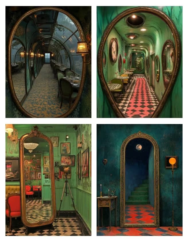 Midjourney Prompt: a full length mirror with ornate brass frame is tilted at an angle allowing us to view into an infinitely recursive op art deco dimension in time-space