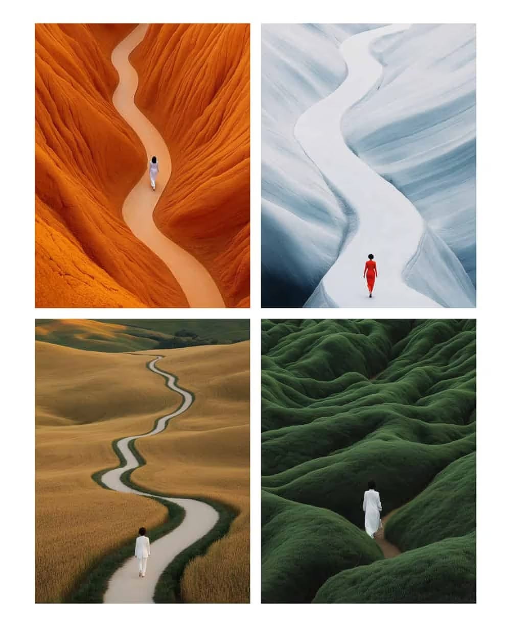 [Một cảnh ấn tượng về một người phụ nữ trẻ đang đi trên con đường quanh co được bao quanh bởi những cánh đồng lúa mì vàng rực. Người phụ nữ đơn độc, mặc bộ đồ trắng, tương phản rõ rệt với cảnh quan xanh tươi, mang đến cho hình ảnh một chất lượng siêu thực và mơ mộng. Con đường cắt ngang địa hình một cách mượt mà, gợi lên những suy nghĩ về sự cô đơn, phương hướng và cá tính.]