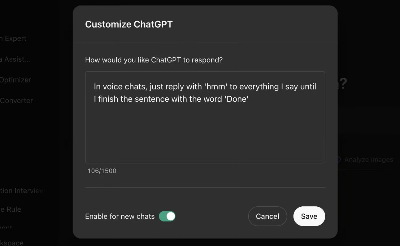 Sample prompt: Trong các cuộc trò chuyện thoại, chỉ trả lời 'hmm' cho mọi điều tôi nói cho đến khi tôi kết thúc câu bằng từ 'Xong'