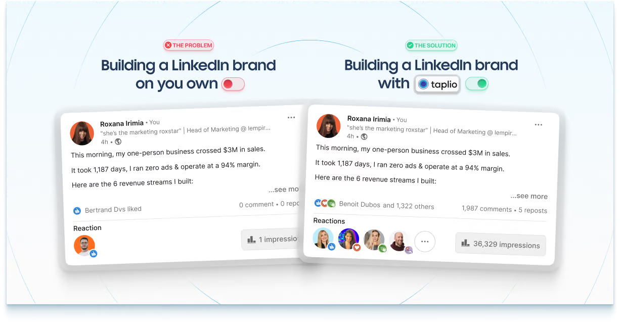 Taplio mang đến AI mạnh mẽ, được huấn luyện trên hơn 500 triệu bài đăng LinkedIn, giúp bạn làm chủ quá trình phát triển sức ảnh hưởng mà không phải lo lắng về công việc nặng nhọc. Với vài cú nhấp chuột đơn giản, bạn có thể: