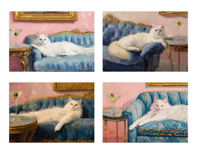 [Một con mèo trắng dài nằm trên một ghế sofa nhung màu xanh và vàng cổ điển. Bên cạnh nó là một bàn với một ly martini có một quả ô liu. Các bức tường có màu hồng. Có cạnh của một khung vàng trên tường. Trường phái ấn tượng, nét cọ, impasto, tonalism Mỹ, chi tiết thấp --ar 7:5 --v 6.1]