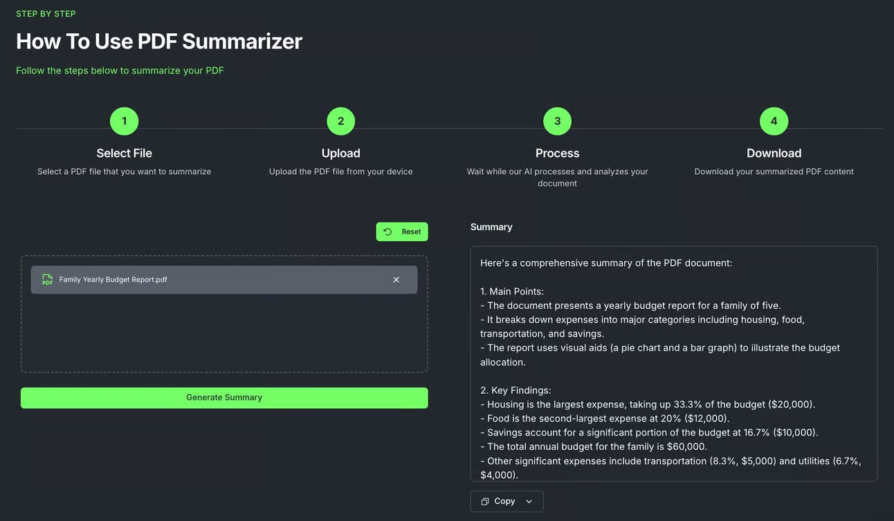 Nhấp vào PDF Summarizer, tải lên tệp PDF của bạn và nhấp vào Generate Summary.