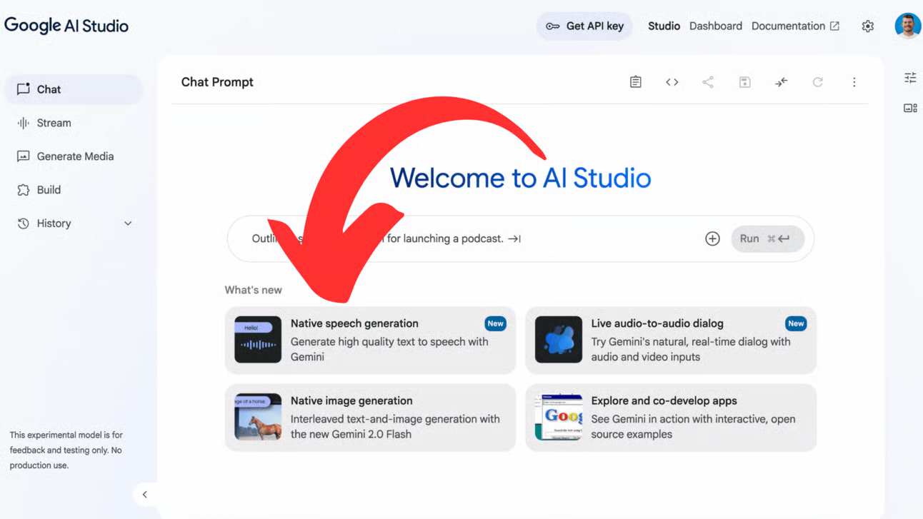 Ghé thăm [Google AI Studio], và chọn “Tạo âm thanh tự nhiên”