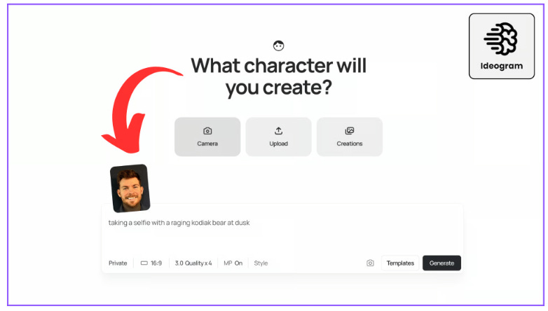 - Truy cập tính năng “Character” của Ideogram và tải lên một ảnh chân dung chính diện, chất lượng cao