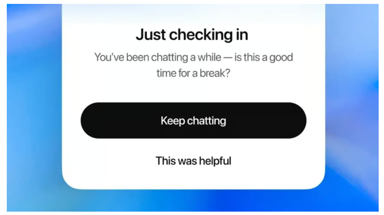 - Họ cũng đang bổ sung các gợi ý nhẹ để người dùng không tham gia vào các cuộc trò chuyện quá dài, đồng thời điều chỉnh cách phản hồi để tránh đưa ra quyết định thay người dùng trong các tình huống hệ trọng, thay vào đó là hỗ trợ người dùng suy xét kỹ lưỡng.