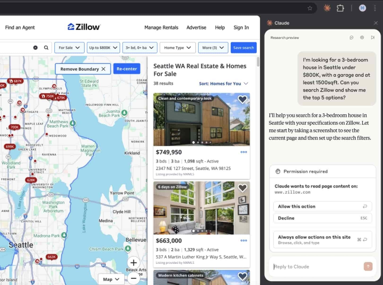 I'm looking for a 3-bedroom house in Seattle under $800K, with a garage and at least 1500sqft. Can you search Zillow and show me the top 5 options?