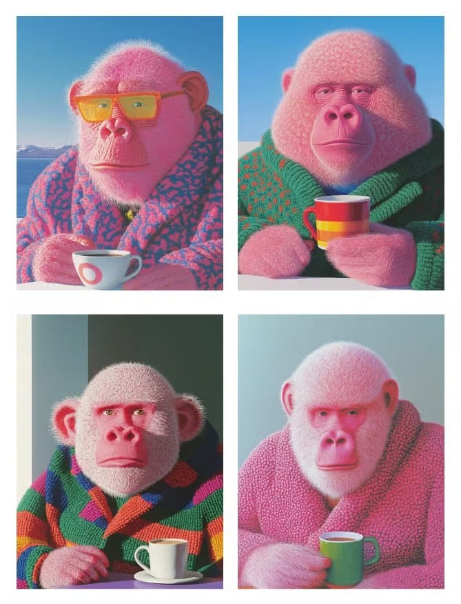 Midjourney Prompt: pink monkey is having a cup of coffee in a cafe, most detailed, 8k
