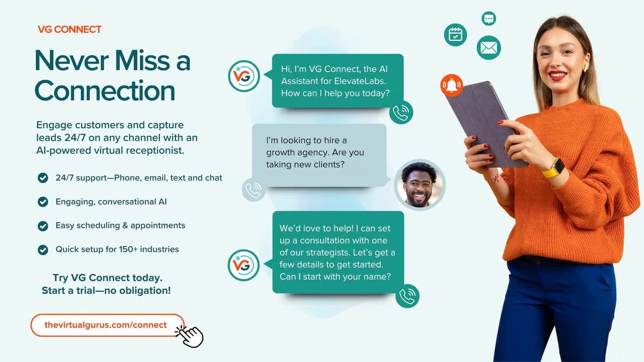 Bạn đã sẵn sàng để không bao giờ bỏ lỡ một khách hàng nào nữa? VG Connect, trợ lý lễ tân AI hoạt động 24/7, mang đến giải pháp toàn diện từ xử lý cuộc gọi, email, tin nhắn, đến lên lịch và phân loại khách hàng tiềm năng. Điều đặc biệt là mọi tương tác đều mượt mà, tự nhiên, như thể bạn đang trò chuyện với một con người thực thụ.