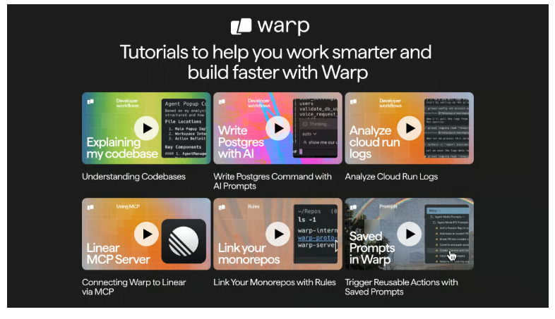 🔥 Điểm mới: Warp University – thư viện tutorial từng bước, giúp bạn áp dụng AI trực tiếp vào quy trình code thực tế.
