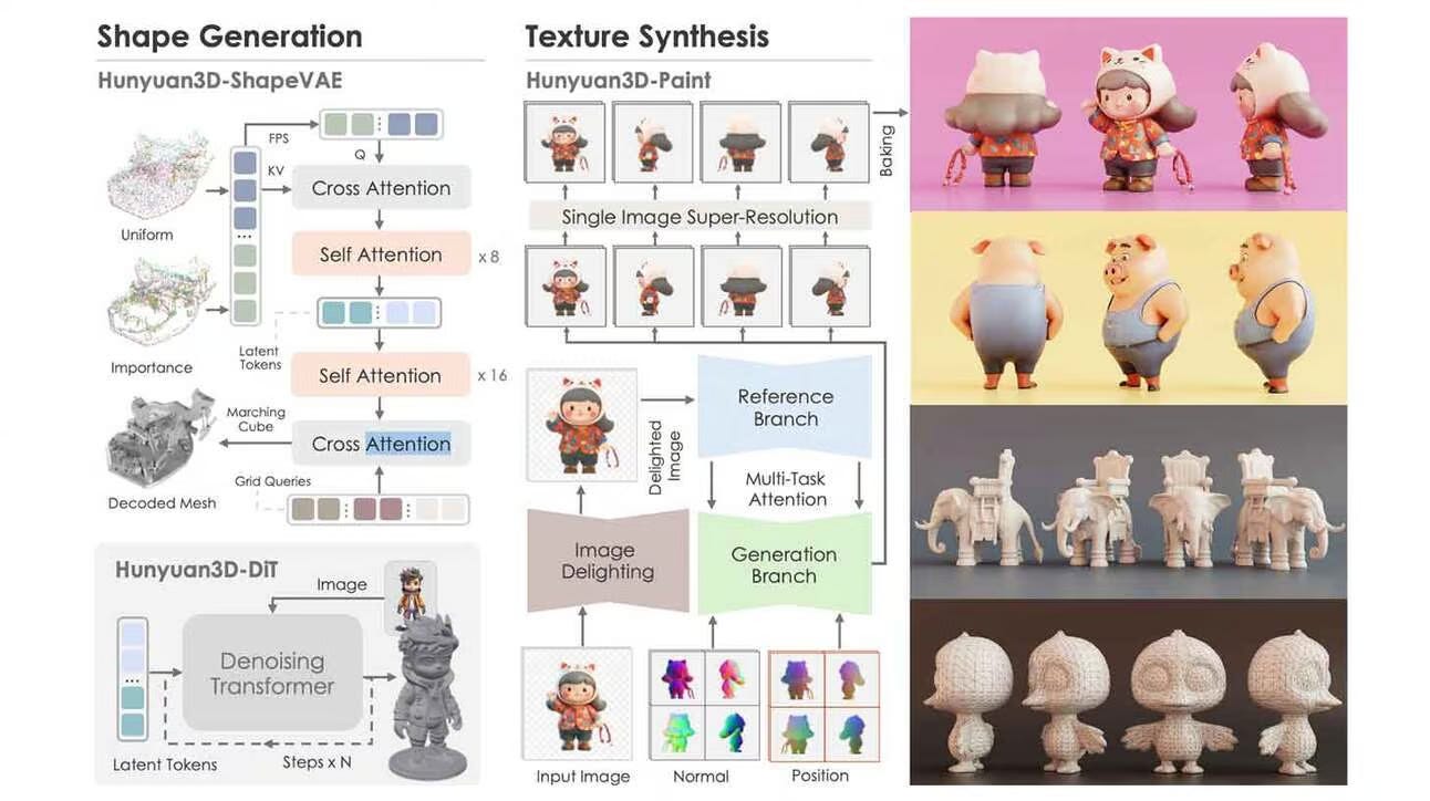 Hệ thống vận hành qua hai giai đoạn: đầu tiên, Hunyuan3D-DiT tạo hình dạng 3D, sau đó Hunyuan3D-Paint bổ sung kết cấu chân thực.