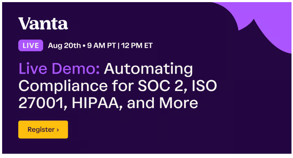 Tham gia buổi trình diễn trực tiếp vào ngày 20/8 để tìm hiểu cách Vanta có thể giúp bạn: