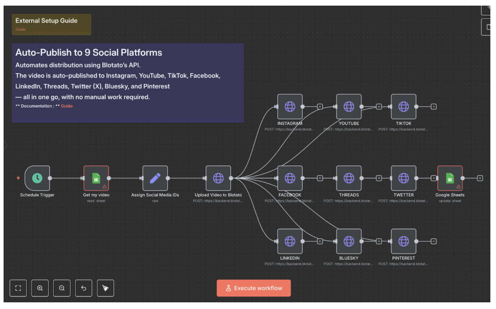- Tìm kiếm “automate multi-platform social media content creation”, chọn mẫu này, thiết lập thông tin đăng nhập cần thiết, rồi nhấn “Execute” để chạy thử.
