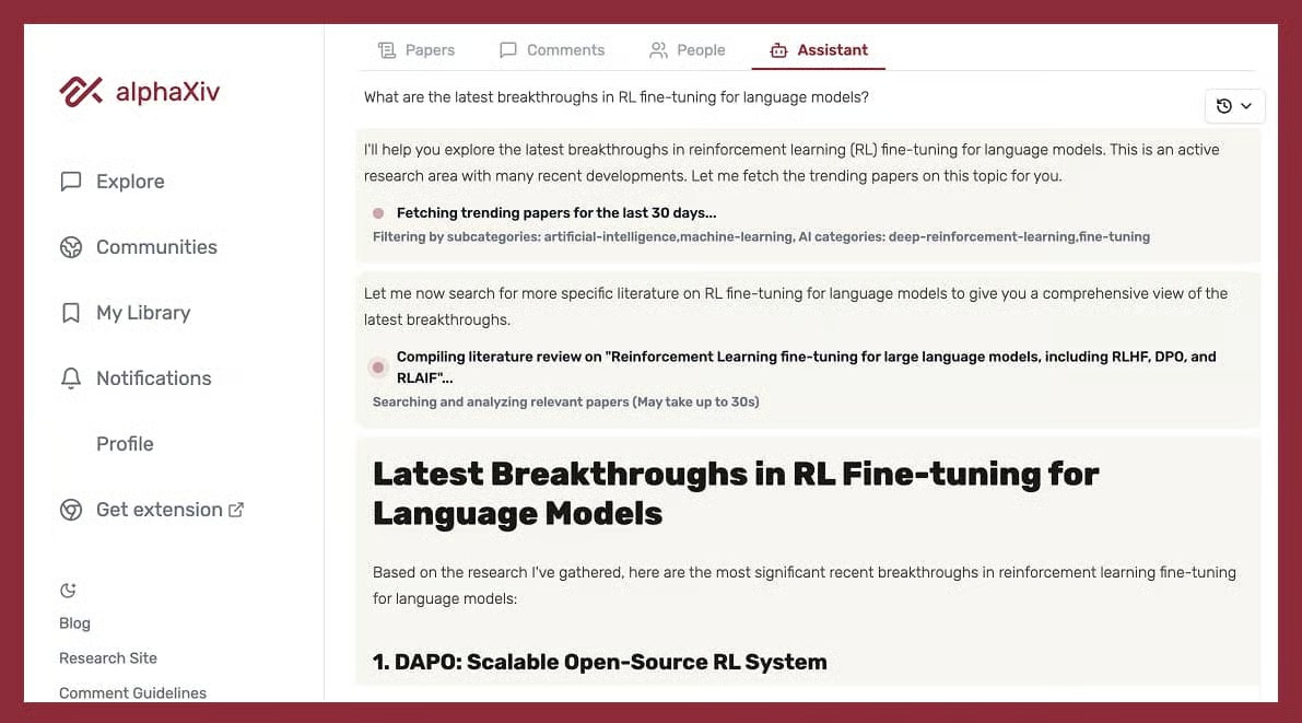 Chờ vài giây, và AlphaXiv sẽ tạo ra một đánh giá văn học toàn diện với các bài báo arXiv nổi bật, tóm tắt và bối cảnh.