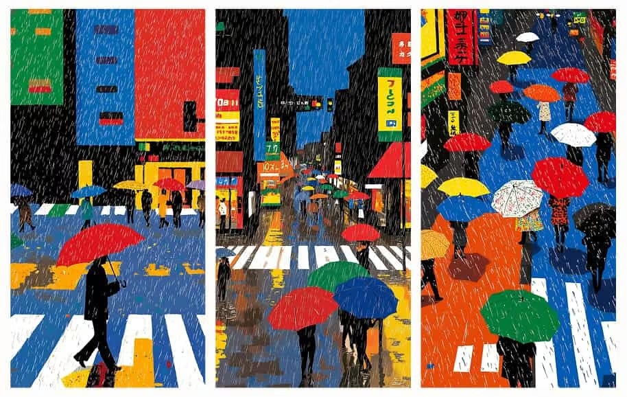 Prompt Midjourney: On rainy days, on the streets of Japan, the color matching effect is obvious, real photography, photography works, high quality, sparse people walking on the road with umbrellas --sref 3359732698 --sw 500 --v 6.1 --stylize 500 --profile r4vd5m3 --ar 9:16