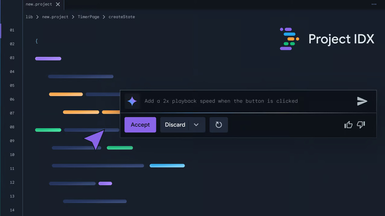 Project IDX cung cấp một môi trường phát triển đám mây đầy đủ tính năng, được tích hợp trực tiếp với AI Gemini của Google — tất cả đều hoạt động ngay trong trình duyệt của bạn.
