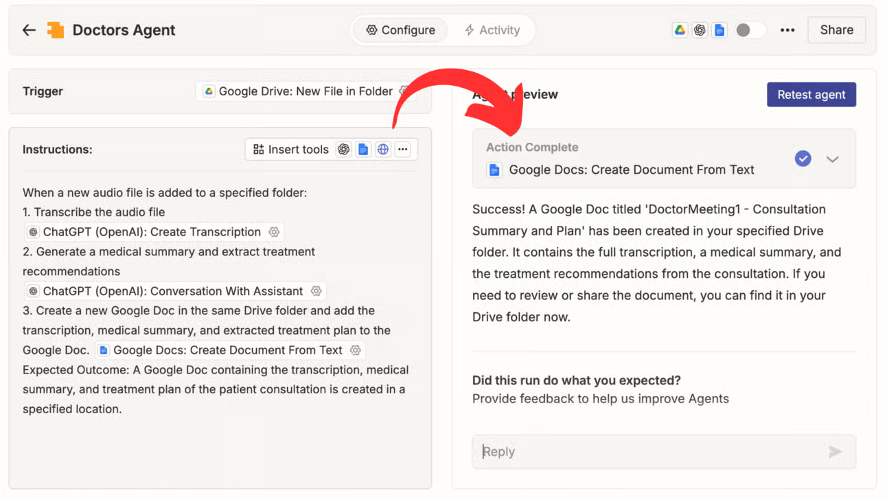 Cấu hình agent của bạn để kích hoạt khi các tệp âm thanh mới (được ẩn danh) được tải lên thư mục được chỉ định trong Google Drive