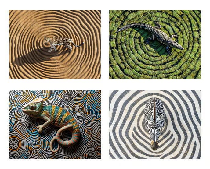 Midjourney Prompt: Aerial view of a [insert animal here] walking across and deep into a series of [insert animal] skin pattern, the contrast between the [insert animal] circles and lines below creates a mesmerizing visual effect, great optical art, minimalistic