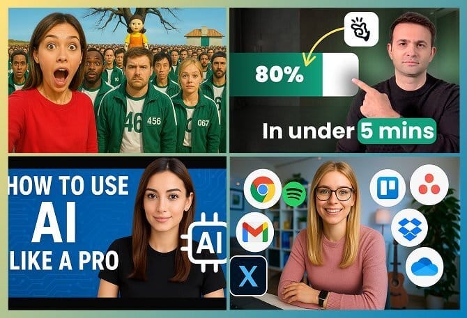 Prompt mẫu: “Tạo một ảnh bìa YouTube của một người đàn ông tỏ ra kinh ngạc với đôi mắt phát sáng, được bao quanh bởi mã bay và ánh sáng neon. Thêm văn bản nổi bật ở bên: 'AI Vừa Phá Vỡ Internet!”