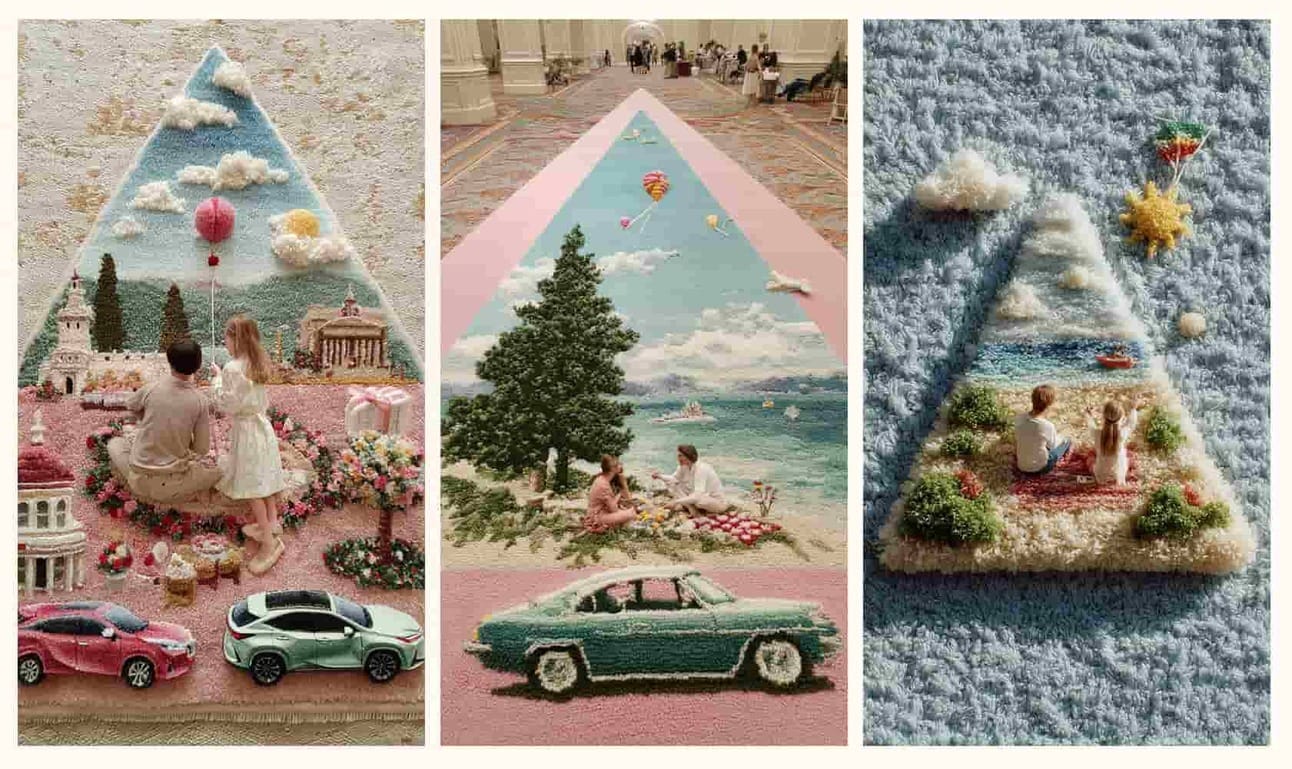Midjourney Prompt: A three-dimensional triangle made of carpet material. the pattern depicts a 2023 LEXUS NX and a young couple having a picnic in triangle shape carpet, A child flying a kite, green Asia carpet pattern, Gabbeh, composition --ar 9:16 --v 7 --stylize 250 --profile sss5f49
