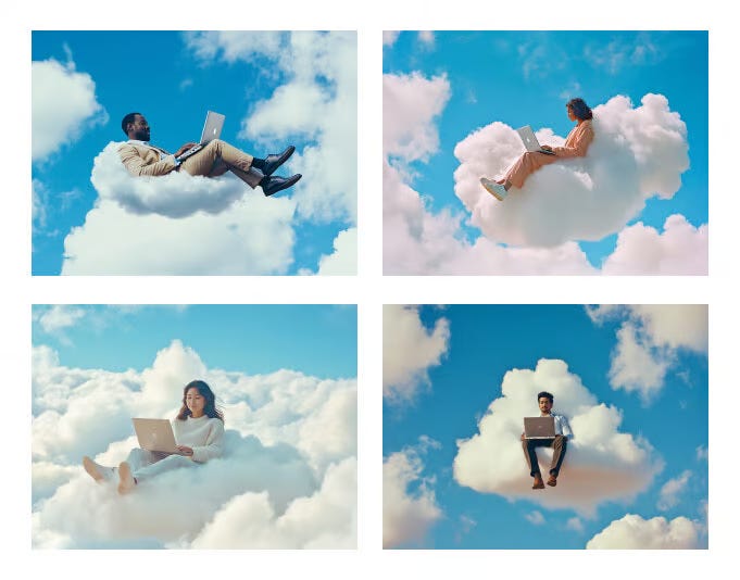 Midjourney Prompt: Business woman/man floating in the clouds with his laptop. Dreamy big clouds. Blue sky. Shot on 35 mm film