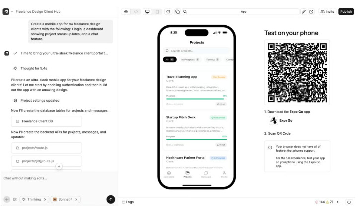 Ví dụ gợi ý: “Tạo một ứng dụng di động cho khách hàng thiết kế tự do của tôi với các tính năng sau: đăng nhập, bảng điều khiển hiển thị cập nhật trạng thái dự án và chức năng chat.”