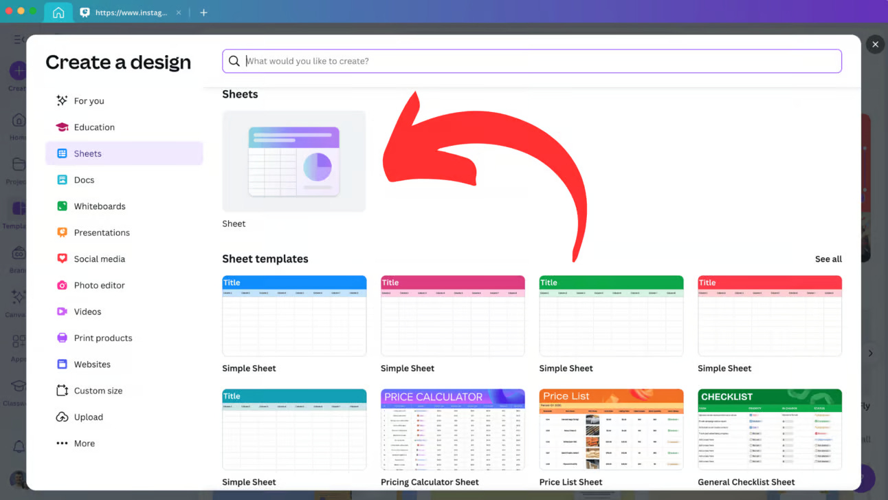 Trong Canva, nhấp vào "Tạo" và chọn "Trang tính" từ menu thả xuống.