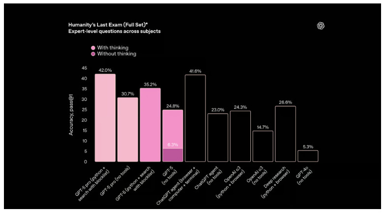- GPT-5 có khả năng bật/tắt chế độ “tư duy” theo thời gian thực (tùy theo tác vụ) và đạt hiệu suất hàng đầu thế giới trong các bài kiểm tra lập trình, viết lách, toán học và y tế.