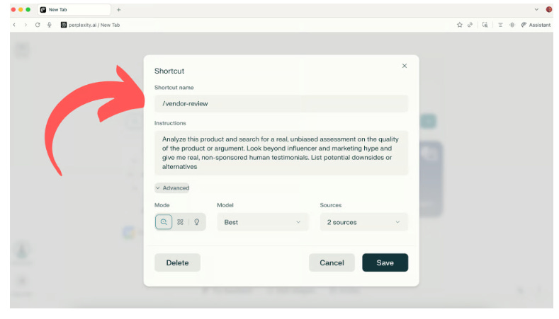 - Nhập câu lệnh: “Phân tích sản phẩm này và tìm kiếm đánh giá thực tế, khách quan. Cung cấp cho tôi các nhận xét không được tài trợ và những điểm hạn chế tiềm ẩn”, rồi đặt tên là vendor-review.