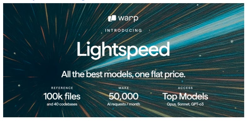 Warp là tác nhân AI hỗ trợ lập trình đạt hiệu suất hàng đầu trong các bài kiểm thử, được hơn 600.000 lập trình viên tin dùng. Gói Lightspeed mới của Warp mang đến hạn mức hàng tháng hào phóng nhất trên thị trường, với quyền truy cập vào các mô hình AI tốt nhất từ nhiều nhà cung cấp.
