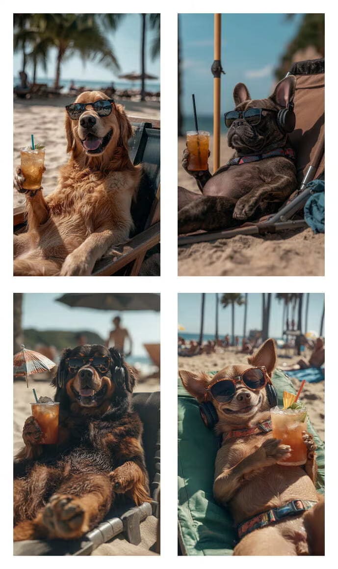[Một chú chó [chèn giống chó tại đây] nằm trên một ghế dài trên bãi biển, cầm một ly đồ uống nhiệt đới với chiếc ô nhỏ trong tay, đang đeo tai nghe hiện đại và kính râm phong cách cổ điển khi tắm nắng. Khung cảnh có bãi biển đầy cát vàng, bầu trời trong xanh và cây cọ làm nền. Ánh sáng mặt trời ấm áp tăng cường bầu không khí thoải mái và vui tươi.]