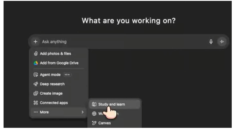 - Trong ChatGPT, chọn “GPT-5” → nhấn “+” → mở “More” settings → bật “Study & Learn”.
