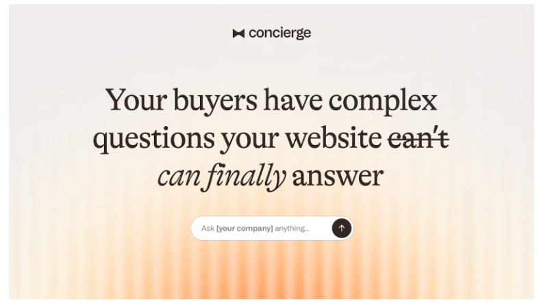 Người mua SaaS ngày nay sử dụng AI mỗi ngày để trả lời các câu hỏi của họ và không muốn mất thời gian đi tìm thông tin. Concierge là một cỗ máy trả lời theo phong cách Perplexity, được huấn luyện dựa trên công ty của bạn, đặt ngay trên website và cung cấp câu trả lời chính xác, cá nhân hóa cho những câu hỏi cực kỳ cụ thể.