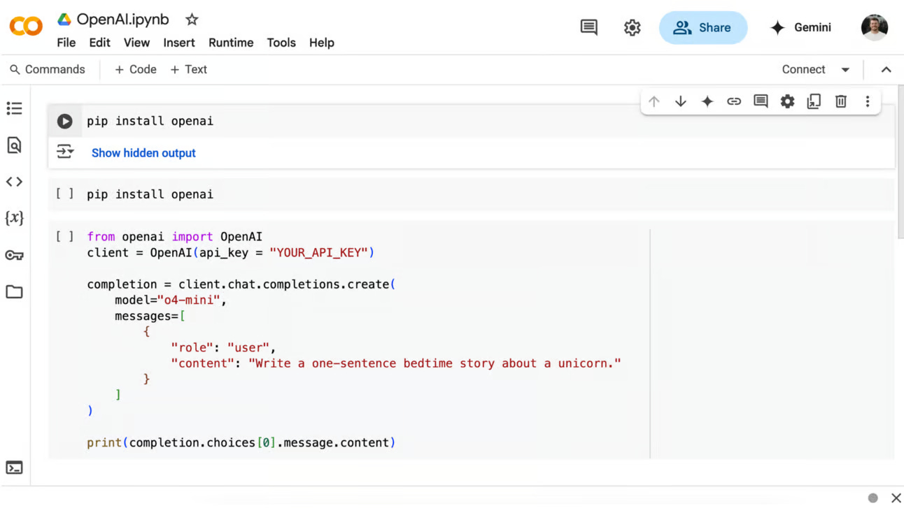 Cài đặt môi trường của bạn trong Google Colab và cài đặt thư viện OpenAI với pip install openai.
