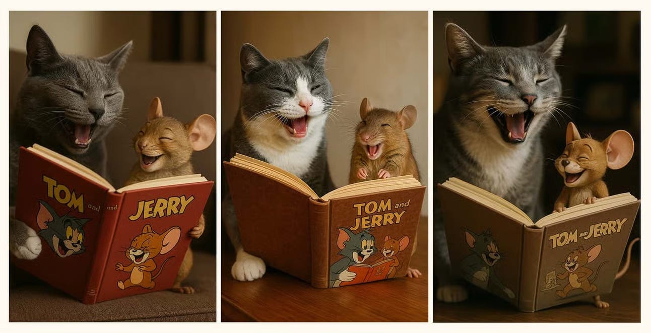 Prompt ChatGPT: trong đời thực, tom và jerry đang đọc những câu chuyện của họ từ cuốn sách và cười về nó