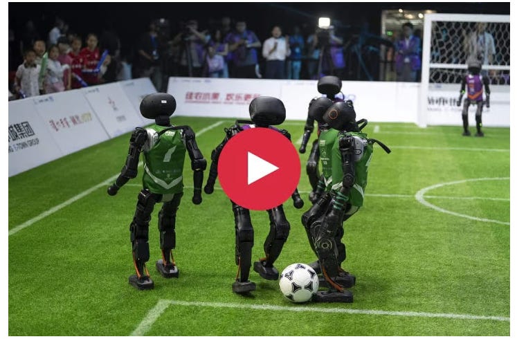 Giải đấu Robot Hình Người Thế giới đầu tiên trên thế giới sẽ diễn ra từ ngày 15 đến 17 tháng 8 tại Bắc Kinh, với sự tham gia của 30 đội đến từ Mỹ, Brazil, Đức, Bồ Đào Nha và nước chủ nhà Trung Quốc, thi đấu trong môn bóng đá năm người hoàn toàn tự động. Những vận động viên kim loại này được trang bị cảm biến hình ảnh để theo dõi quả bóng và có khả năng tự đứng dậy sau khi ngã (và chắc chắn sẽ có nhiều lần như vậy).