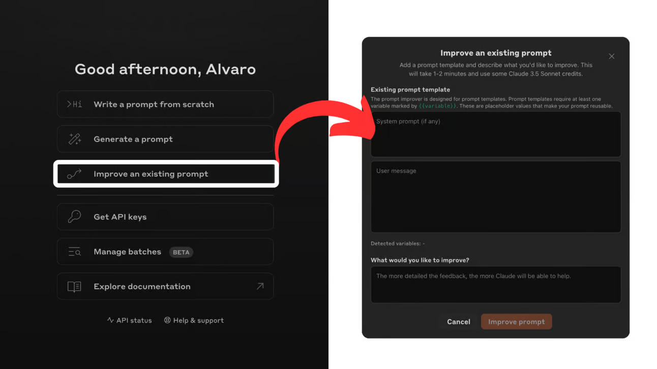 Truy cập bảng điều khiển Console của Anthropic và chọn "Cải thiện lời nhắc hiện có"