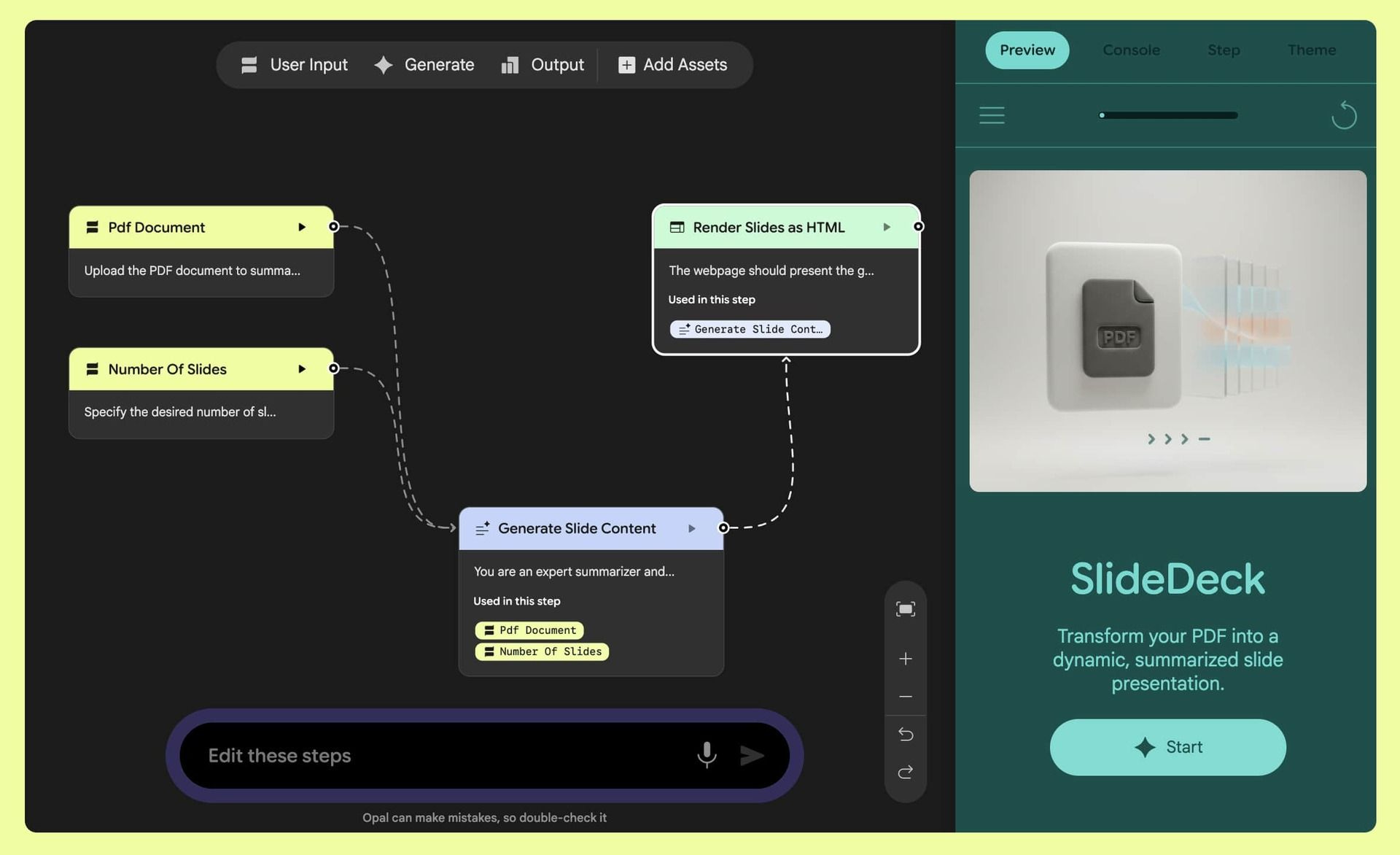 Ví dụ yêu cầu: Tôi muốn tạo các slide từ tệp PDF. Yêu cầu người dùng tải lên tài liệu PDF và số lượng slide cần tạo. Dựa trên nội dung PDF, hãy tạo số lượng slide theo chỉ định của người dùng. Không tạo bản trình bày Google Slides; hãy hiển thị nội dung dưới dạng HTML và trình chiếu các slide dưới dạng HTML với định dạng phù hợp.