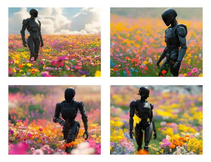 (Lời nhắc giữa hành trình: Robot ĐEN cyberpunk đi bộ qua cánh đồng hoa đầy màu sắc tuyệt đẹp, siêu thực, 8k,)